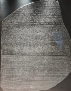 Replica van de Steen van Rosetta in het Rijksmuseum van Oudheden. Het origineel bevindt zich in het British Museum in Londen. Foto: Sarah Remmerts de Vries.