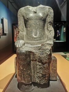Zitbeeld van koning Toetanchamon, ca. 1325 v. Chr. Dit beeld werd waarschijnlijk door Egyptische gravers gevonden in het tempelcomplex van Karnak. Collectie Rijksmuseum van Oudheden. Foto: Sarah Remmerts de Vries.