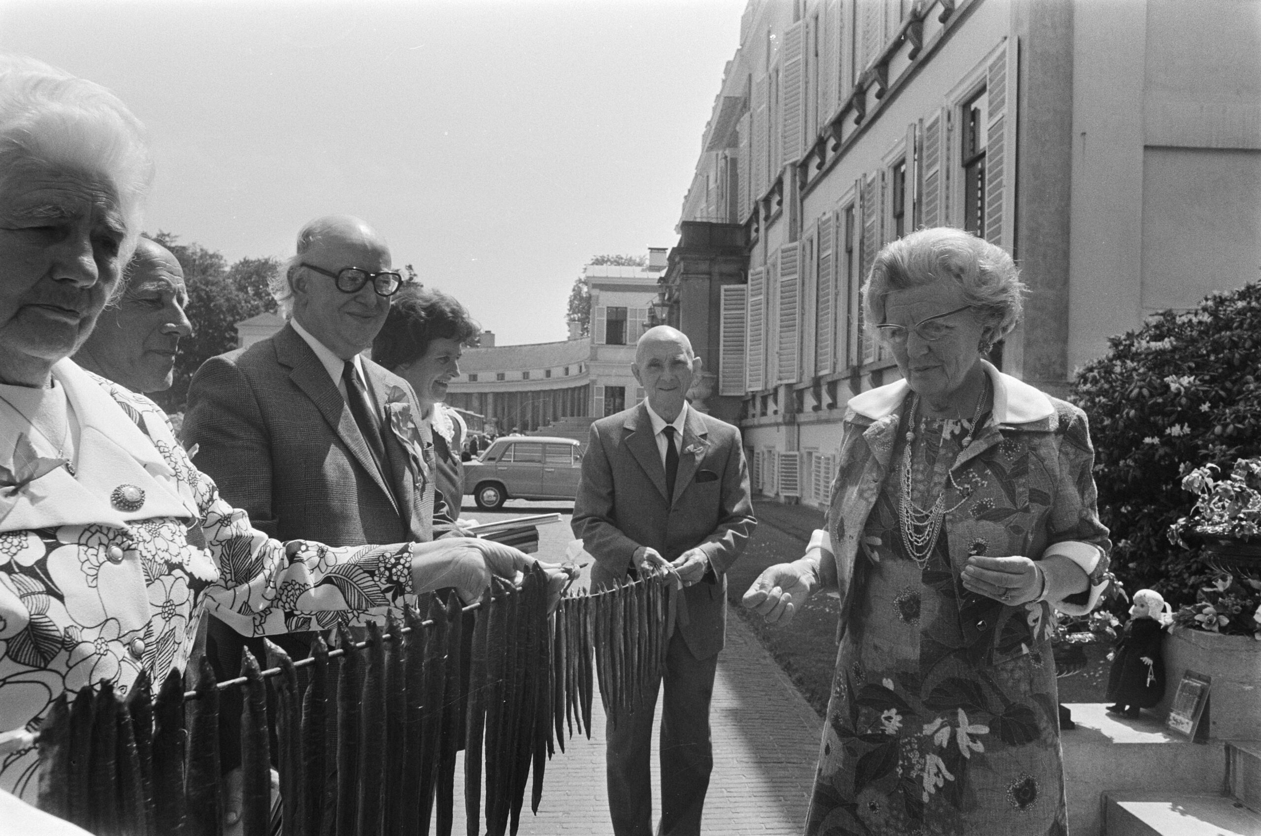 Koningin Juliana krijgt paling uit Monnickendam aangeboden tijdens een bejaardendefilé op Paleis Soestdijk, 1974. Collectie Nationaal Archief.