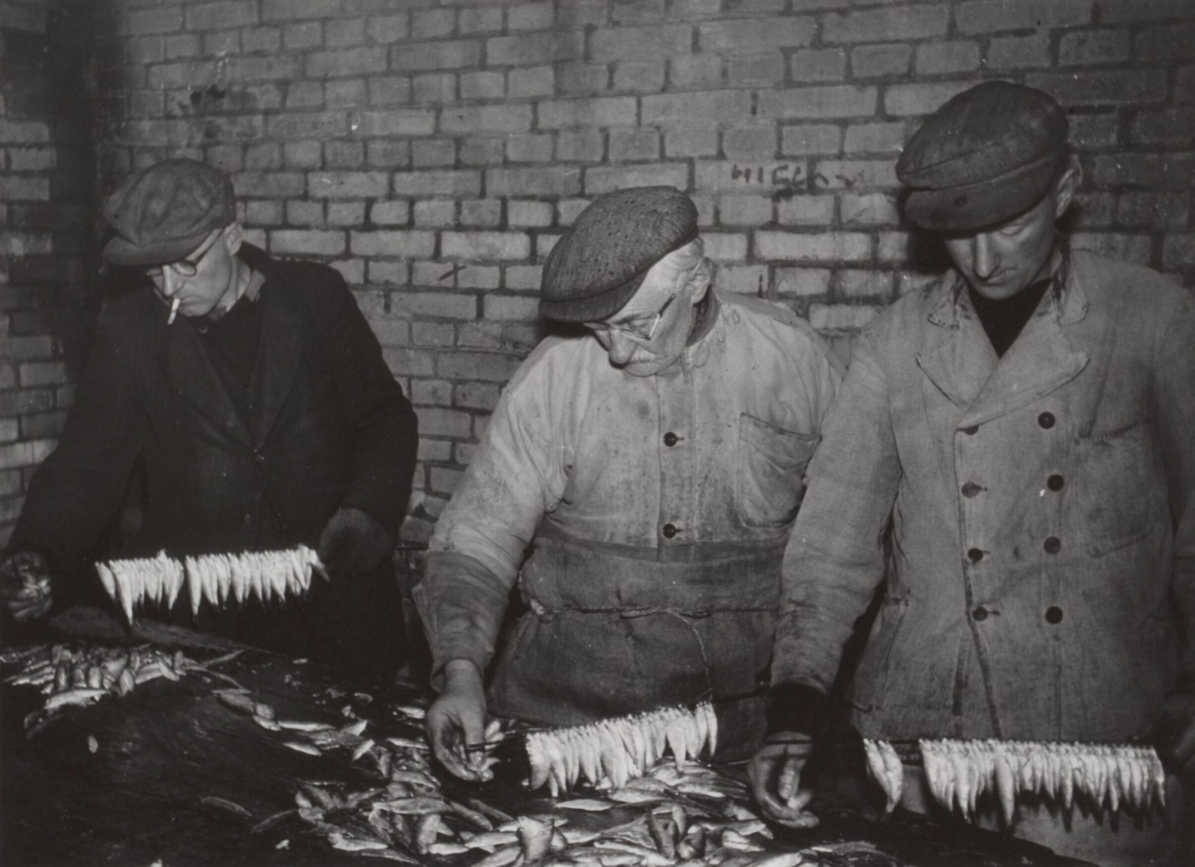 Sprot wordt aan pennen geregen in Monnickendam. Collectie Nationaal Archief.
