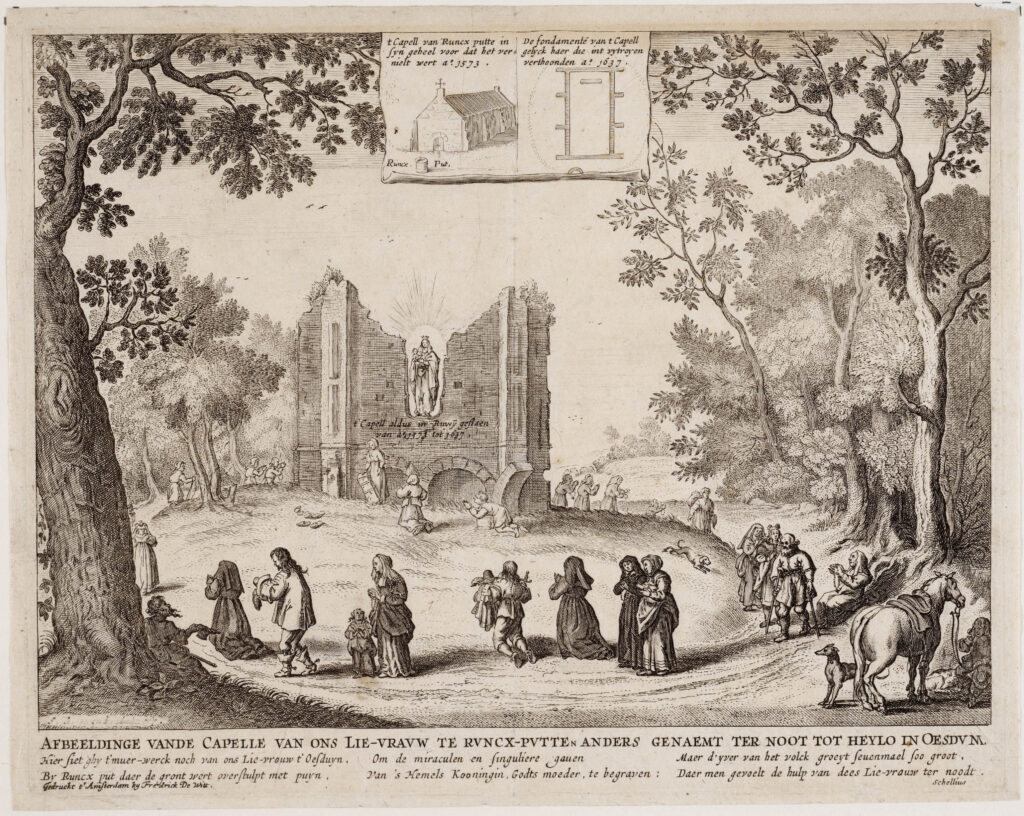 De ruïne van de kapel van Onze Lieve Vrouw Ter Nood met pelgrims in processie. De verschijning van Vrouwe Maria is te zien tussen de muurresten. Boven de ruïne een inzet met de afbeelding van de kapel in welstand met plattegrond. Vervaardiger: onbekend, 1690. Collectie Regionaal Archief Alkmaar / Catalogusnummer PR 1001278.