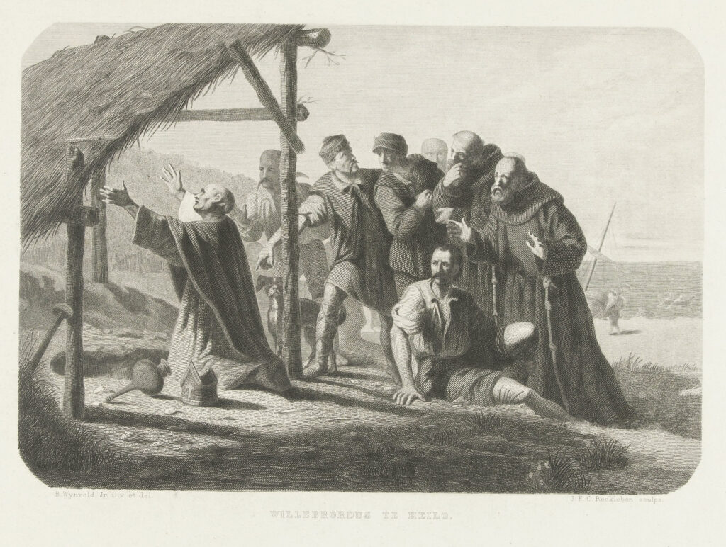 Historieprent van Willibrord te Heiloo, ca. 680-735. Vervaardiger: Jan Frederik Christiaan Reckleben (vermeld op object), 1862 – 1864. Collectie Rijksmuseum, objectnummer RP-P-OB-77.773.