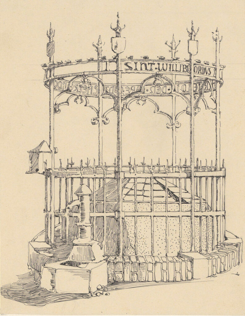Tekening van de Sint-Willibrordusput met smeedijzeren hek, ca. 1900. Vervaardiger: Jacobus Gerardus J.G. Veldheer (1866-1954). Noord-Hollands Archief /Collectie van prenten en tekeningen van de Provinciale Atlas Noord-Holland, inventarisnummer 579.