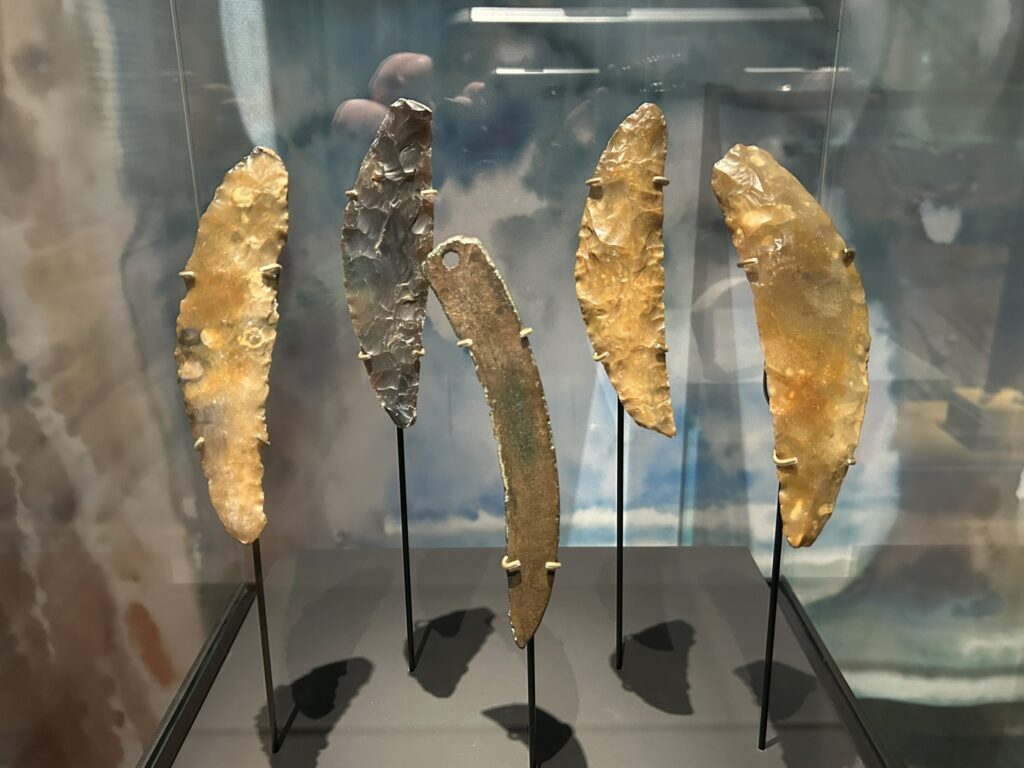 Vier vuurstenen sikkels en een bronzen sikkel, Heiloo, 1000-800 v. Chr. Ze waren te zien in de tentoonstelling ‘Bronstijd. Vuur van verandering’ in het Rijksmuseum van Oudheden te Leiden. Foto: Judith van Amelsvoort, 2025.