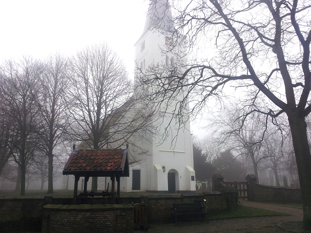 De Witte Kerk en de Willibrordusput in Heiloo zijn gehuld in dichte mist op vrijdag 2 maart 2012. Beeld via Wikimedia Commons, vervaardiger: Heiloo Online, CC BY-SA 2.0.