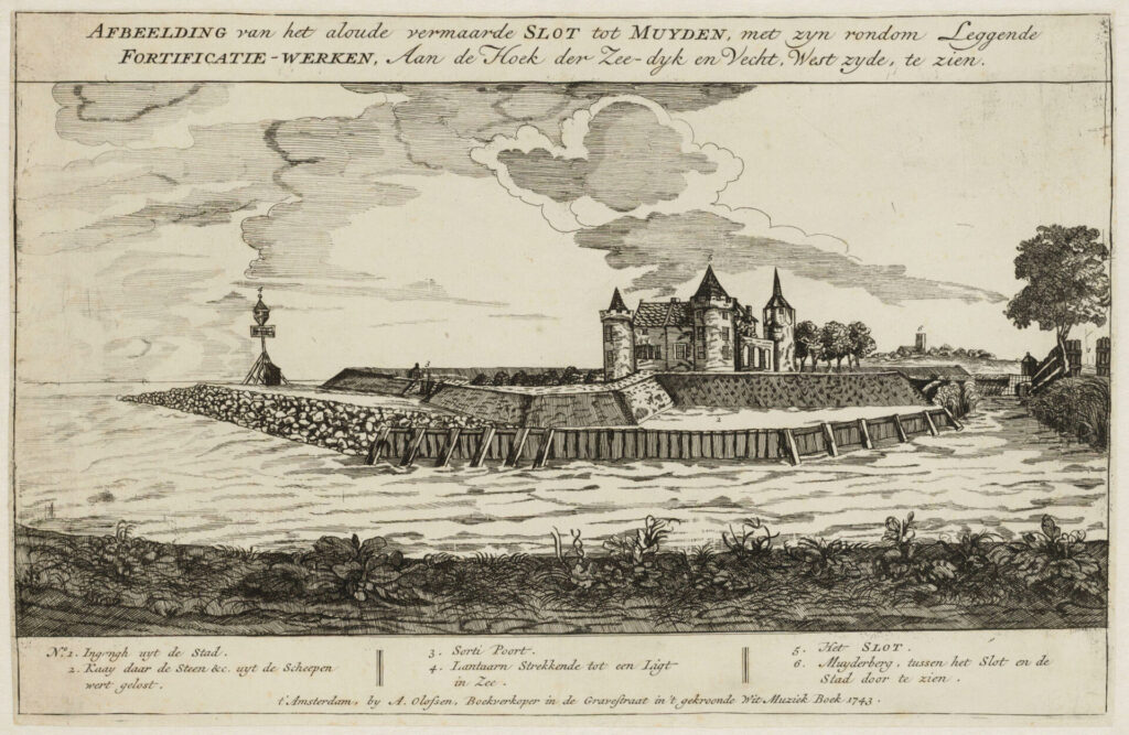 Muiderslot en fortificatiewerken, 1743. Noord-Hollands Archief / Collectie van prenten en tekeningen van de Provinciale Atlas Noord-Holland, Inventarisnummer 1762.