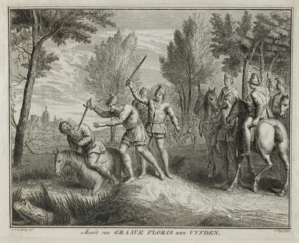 Graaf Floris V wordt op zijn paard vermoord bij Muiden in 1296. Links op de achtergrond het Muiderslot. Noord-Hollands Archief / Collectie van historieprenten van de Provinciale Atlas Noord-Holland, Inventarisnummer 14.