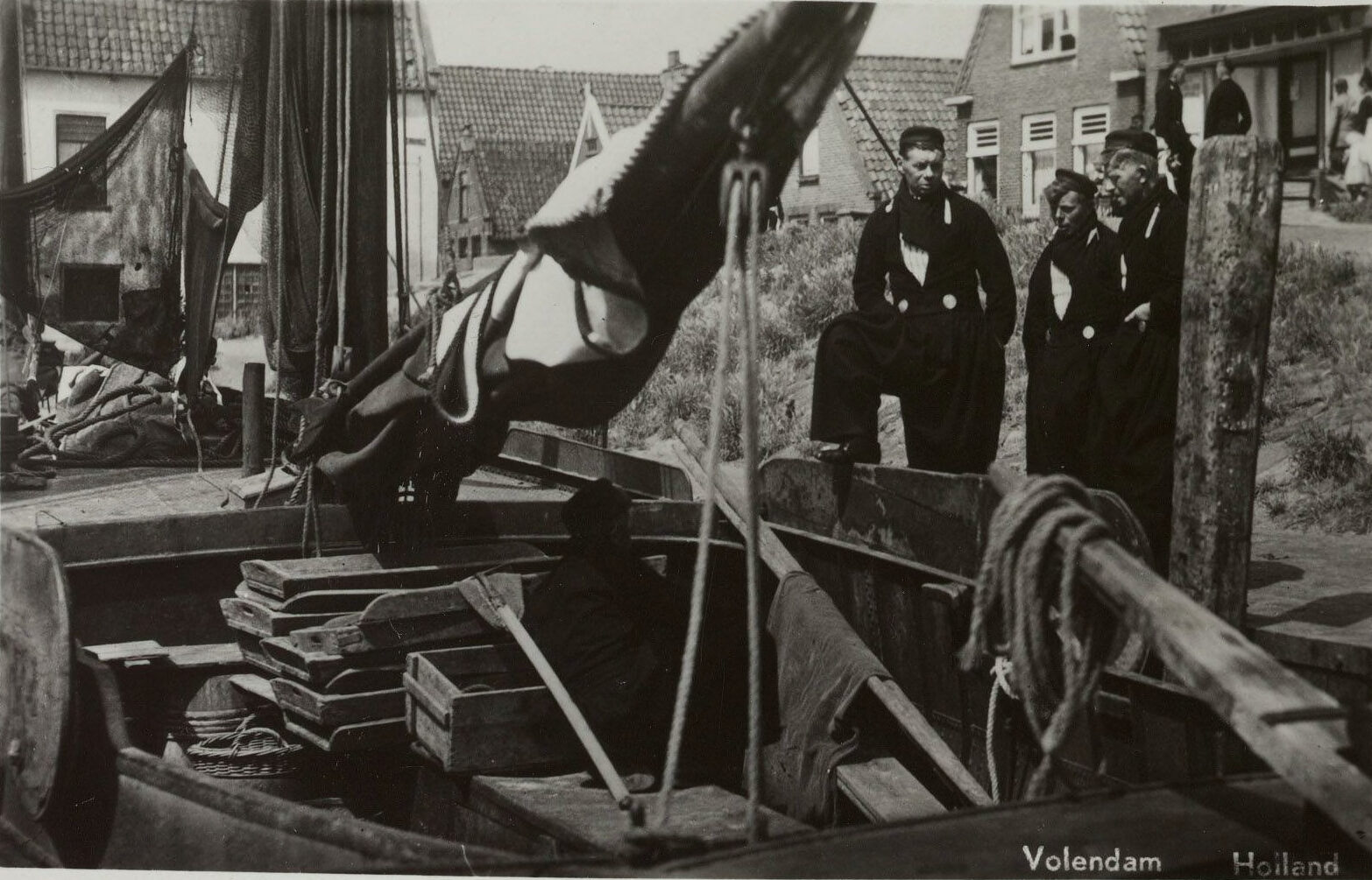 Volendamse vissers bij hun boot, 1930-1940. Collectie Provinciale Atlas Noord-Holland, Noord-Hollands Archief.