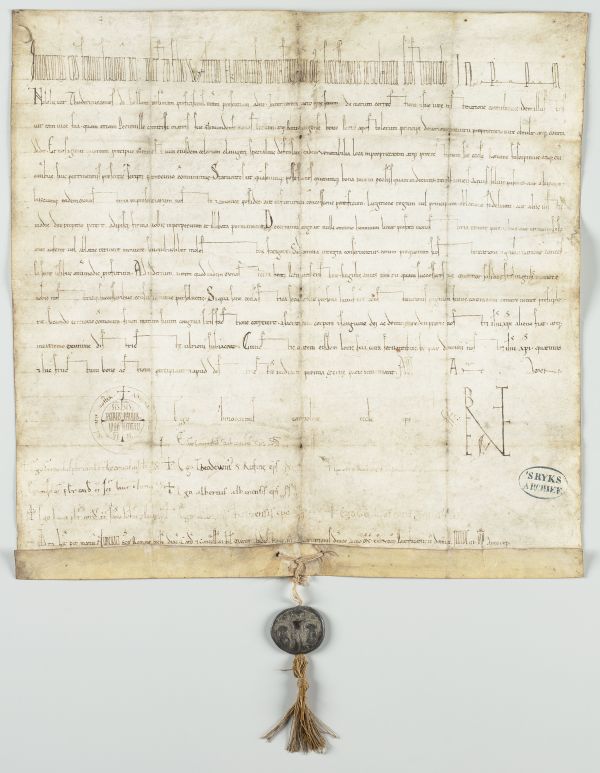 Het oudste stuk van het Noord-Hollands Archief: een pauselijke bul uit 1140. Archief van de Abdij van Egmond, inv.nr. 13, Noord-Hollands Archief.