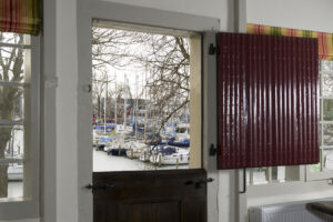Nu kijk je uit op een vredig jachthaventje, maar in de zeventiende eeuw moet het een drukte van jewelste zijn geweest aan de Binnenluiendijk, met al die schepen aan de kade. “Bijzonder is dat het huis een kamer heeft die aan balken is opgehangen, een insteek- of hangkamer, die vooral als kantoor is gebruikt. De voorkamer is vijf meter hoog, dus er was ruimte genoeg voor een extra kamer, waar je via een spil- of wenteltrap kunt komen. Tijdens een restauratie hebben we een muurtje, dat er later onder is gemetseld, weer weggehaald, zodat de hangkamer weer los hangt.”