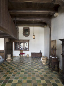 De woonkamer van Huis Bonck, met linksboven de hangkamer en rechts de linnenpers. Foto: Arjan Bronkhorst.