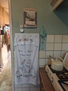 Het koken deed Nel in de typische jaren vijftig keuken aan het eind van de gang, met granito aanrechtblad, petroleumstel en een geruit gordijntje onder de gootsteen. Wie de keukenkastjes opentrekt, ontdekt al snel dat zelfs hier alles nog op zijn oorspronkelijke plek staat. In de kasten liggen Droste cacaoblikken, Melitta koffiefilters en Terra kerriepotjes die vroeger in elk huishouden te vinden waren. Maar ook het dagelijks servies staat hier nog op de plank – voor het zondagse servies was immers een speciale servieskast in de woonkamer gereserveerd.