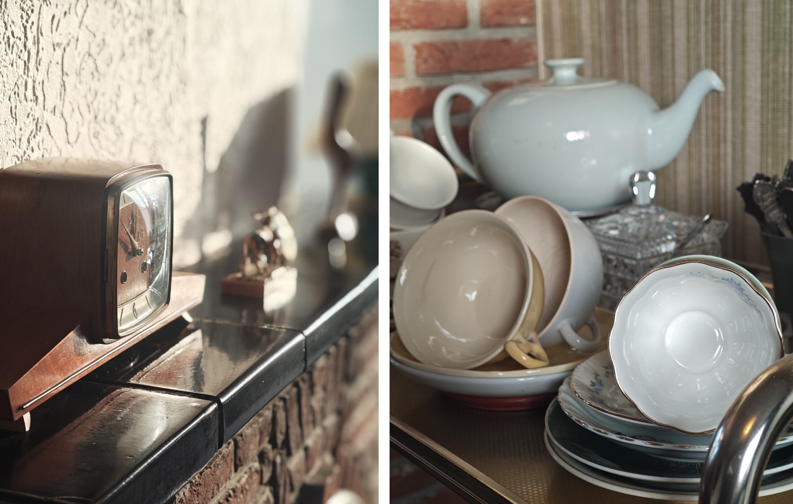 Links: Een opwindbare mantelklok op de schouw geeft de tijd aan. Rechts: Theeservies op een verrijdbare trolley. Foto’s: Sarah Remmerts de Vries.