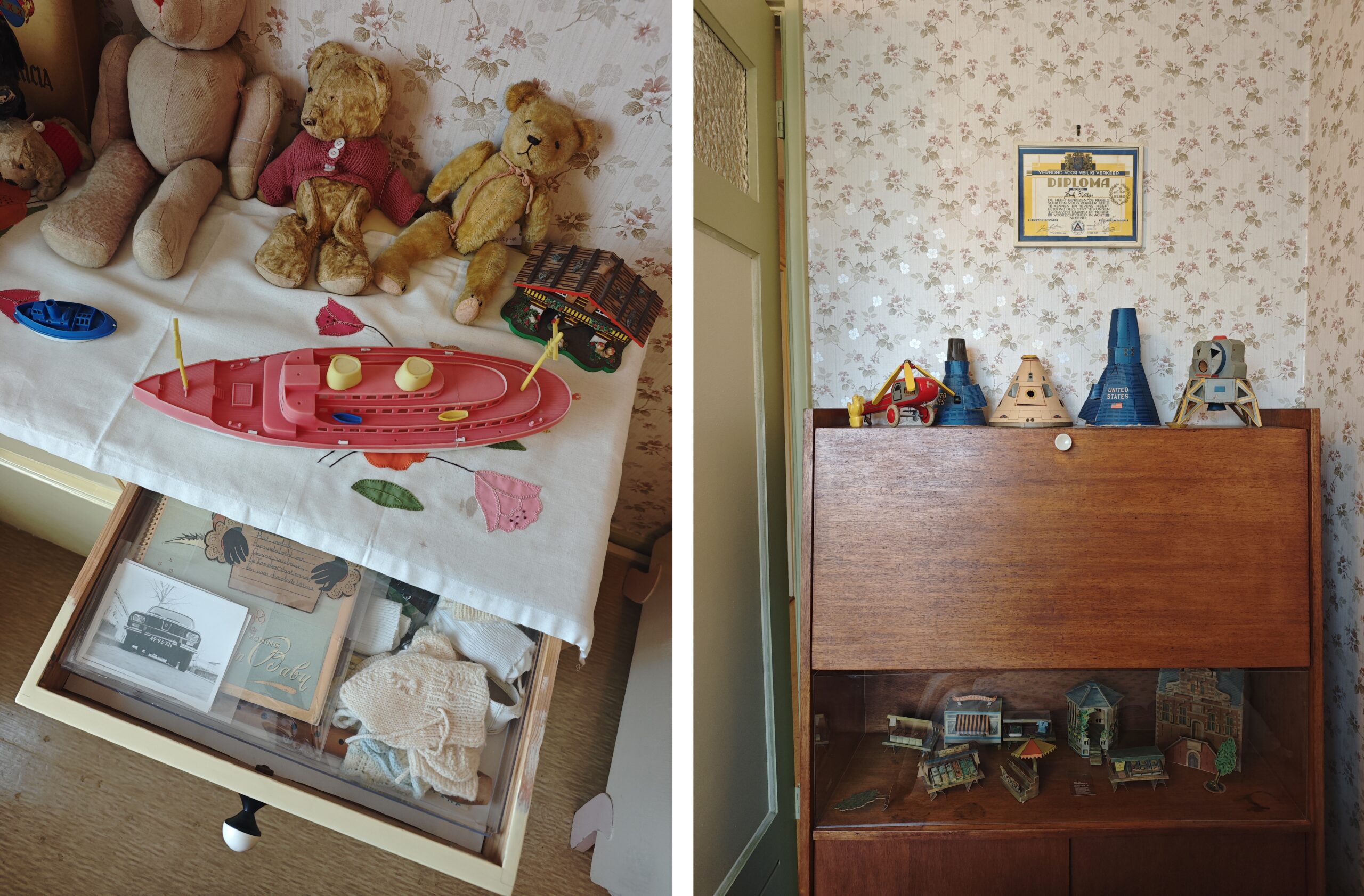 Links: In de lades van de kast in de kinderkamer zijn de babykleertjes van zoon Henk te bewonderen. Rechts: Handgemaakte modellen van ruimtevaartuigen. Foto’s: Sarah Remmerts de Vries.