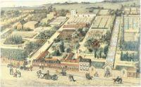 Gezicht in vogelvlucht op de kwekerij ‘Bloemhof’ van E.H. Krelage en Zoon aan de Kleine Houtweg te Haarlem, ca. 1885.