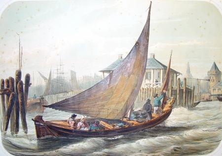 Via de sluis in Nieuwendam bereikt De Nieuwe Kaai het open water van het IJ. Een inmiddels opgestoken briesje uit het noordoosten doet de mannen besluiten om de masten op te zetten en onder zeil verder te gaan. Na enkele minuten varen ze voor de wind naar de stad aan de overkant. “Er staat weinig golfslag vandaag. Dat heb ik wel anders meegemaakt”, bromt de oudste van de roeiers tegen zijn veel jongere buurman. “Dertig jaar geleden ben ik hier een keer bijna verzopen. Je had toen nog stroming, de Oranjesluizen bestonden nog niet. Als het tij naar binnen liep en de wind stond er tegen in, dan kon je wat beleven. Golven man, huizenhoog. In een windvlaag schepten we opeens water. Gelukkig zijn we niet omgeslagen, maar het had maar een haartje gescheeld.”