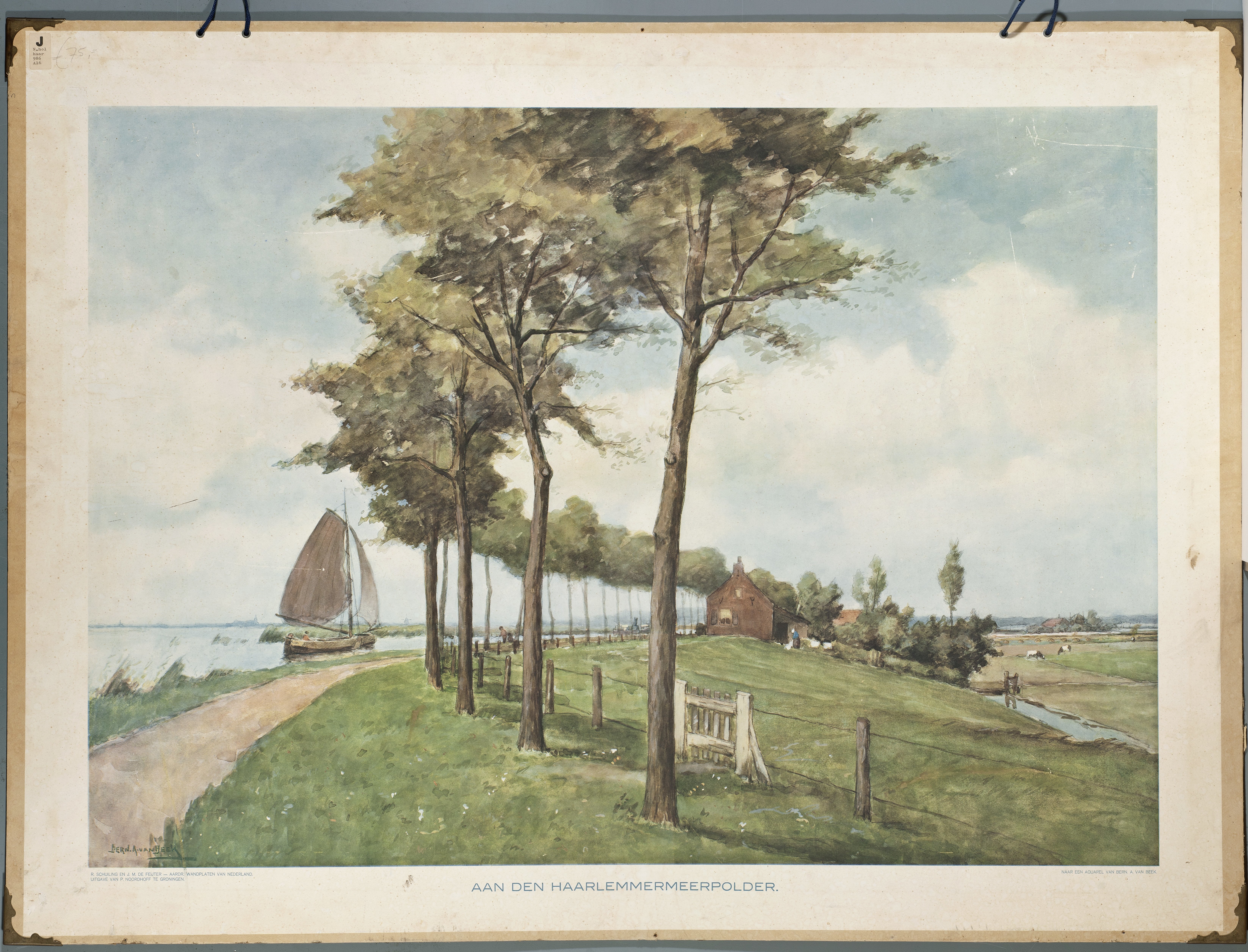 “Aan den Haarlemmermeerpolder”, schoolplaat naar een aquarel van Bern. A. van Beek met daarop een landschap met een dijk, een boot en een boerderij aan de polder, ca. 1920-1930. Collectie Provinciale Atlas, Noord-Hollands Archief.