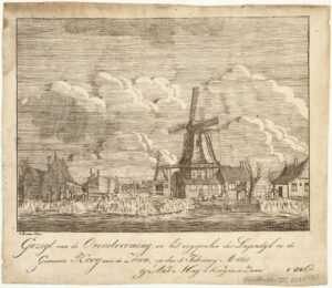 Gezicht op de Lagendijk te Koog aan de Zaan met de aanliggende bebouwing van woonhuizen en molen De Bleeke Dood, tijdens de overstroming van 5 februari 1825. Noord-Hollands Archief / Collectie van historieprenten van de Provinciale Atlas Noord-Holland, Fotonummer 31_00292.