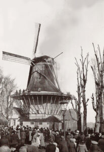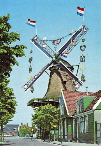 Ansichtkaart van meelmolen De Bleeke Dood in feesttooi i.v.m. het 40-jarig bestaan van het Molenmuseum te Koog aan de Zaan. Foto: 24 mei 1968. Foto via Vereniging De Zaansche Molen, inventarisnummer 0017504.