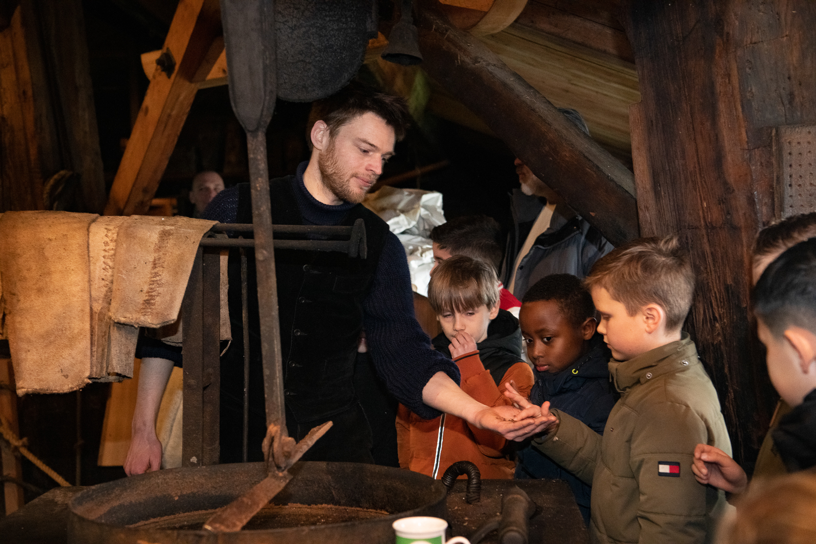 De molenaar-olieslager legt uit. Foto: De Zaansche Molen.