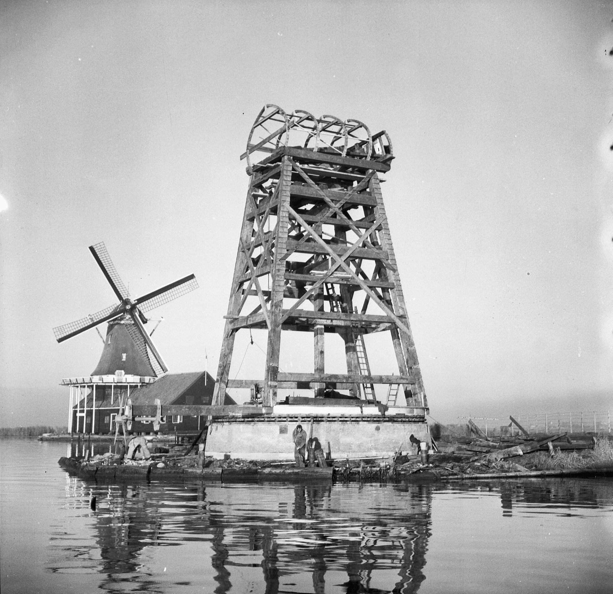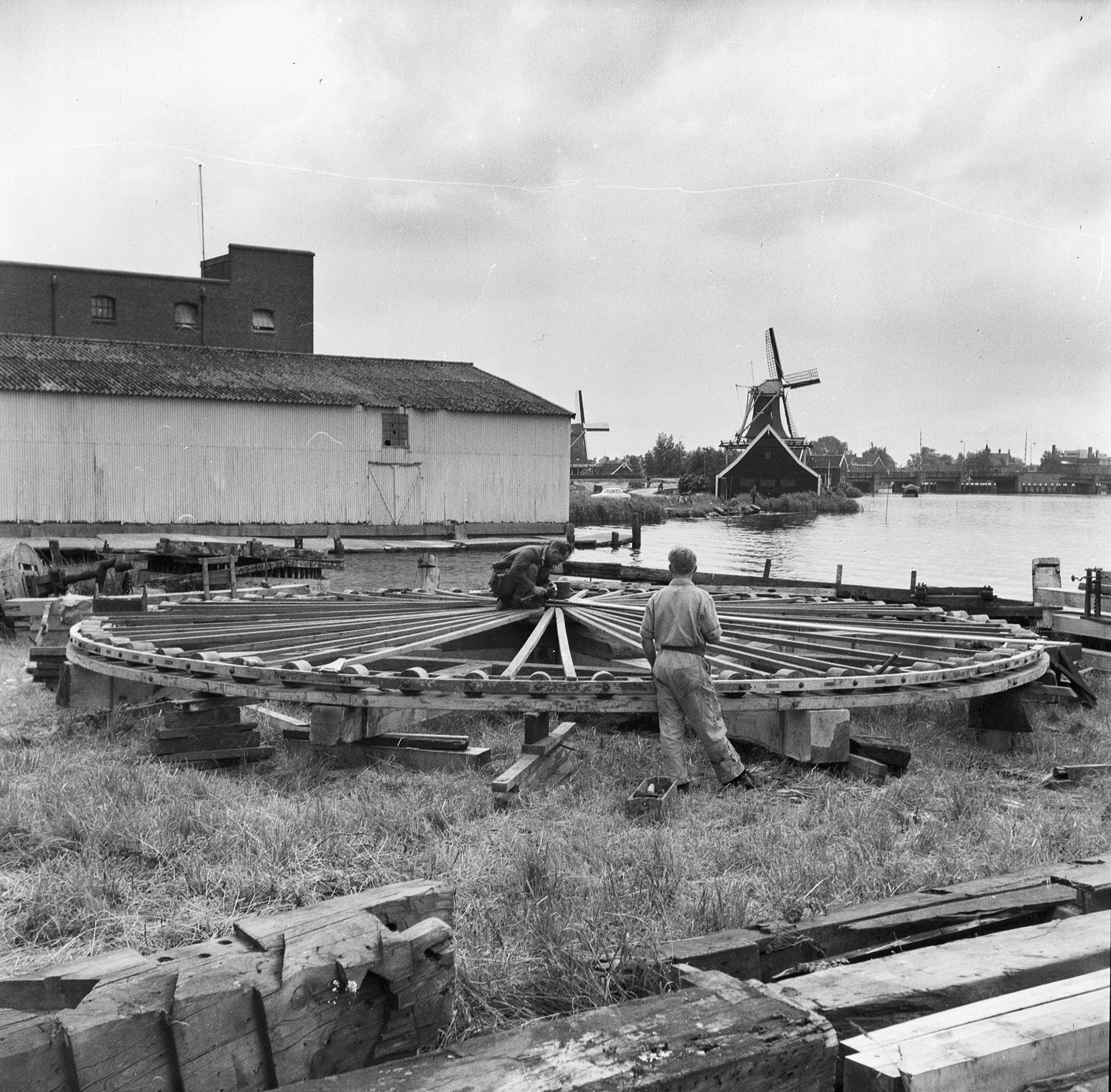 Begin van de herbouw van paltrokmolen De Gekroonde Poelenburg aan de Zaanse Schans. Fotograaf: W.A. Korpershoek, juli 1962. Beeld: Rijksdienst voor het Cultureel Erfgoed, Documentnummer 66.268.