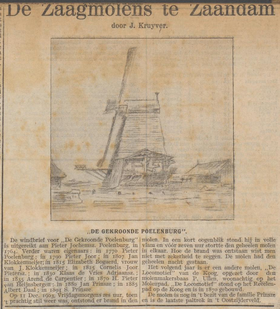 Artikel over De Gekroonde Poelenburg in de krant De Zaanlander, ‘De Zaagmolens te Zaandam’, 12-04-1926, bron: Delpher.