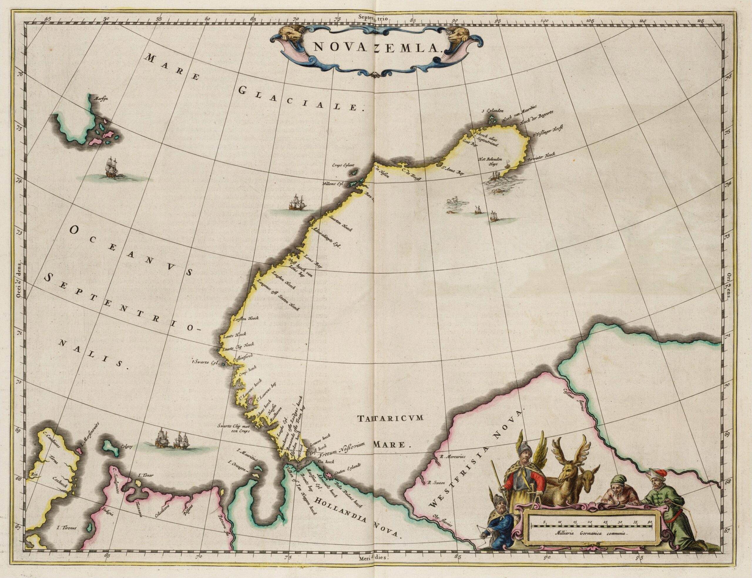 Kaart van het eiland Nova Zembla uit de Atlas van Loon, 1664. Op de kaart is goed te zien hoe ver de expeditie van Barentsz is gekomen. Het Behouden Huis staat aangegeven aan de oostkust. Via Wikimedia (publiek domein).