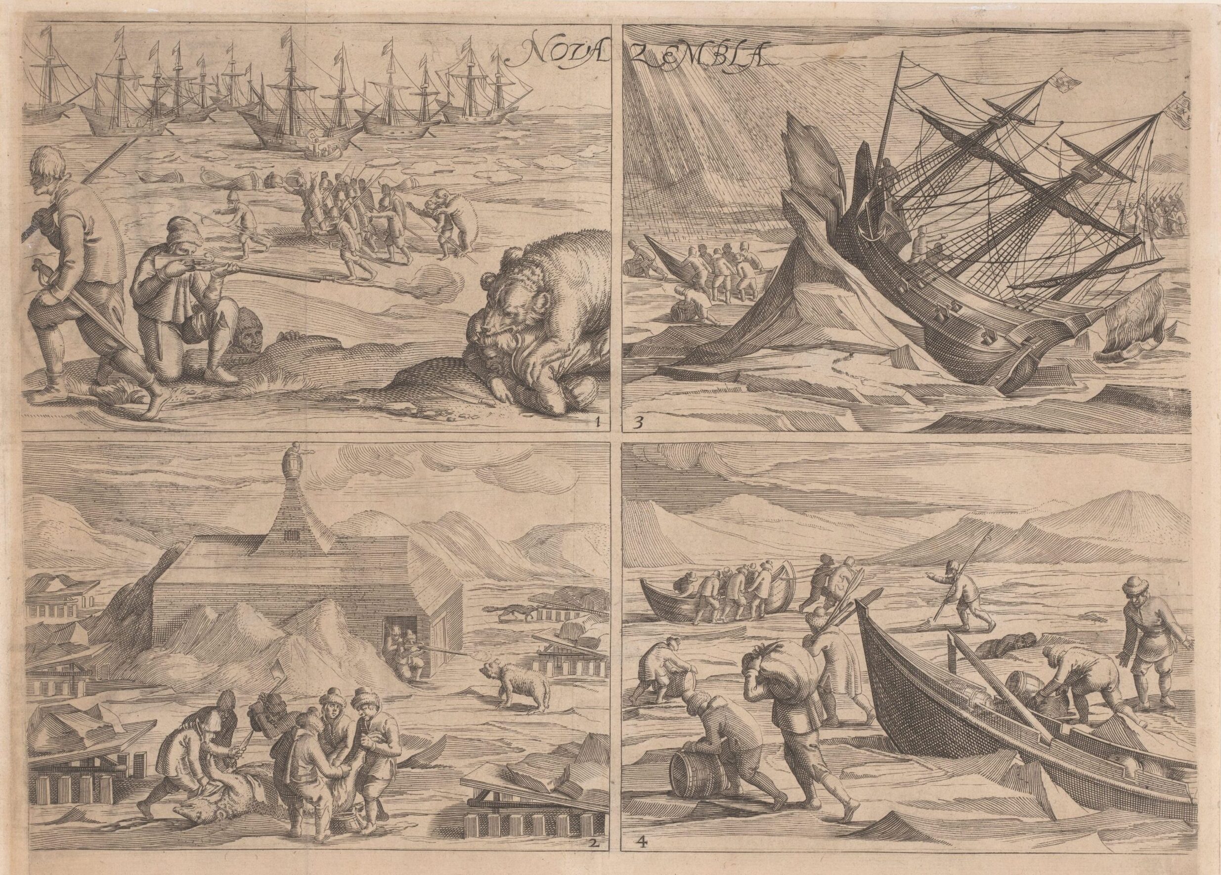 Blad met vier kopieën naar de oorspronkelijke illustraties in het reisverslag van de tocht van Willem Barentsz en Jacob van Heemskerk en het verblijf op het eiland Nova Zembla, 1615-1650. Collectie Rijksmuseum Amsterdam.
