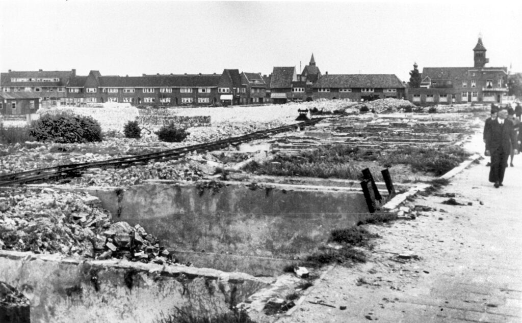 Eind 1943 werd op last van de Duitse bezetter een derde deel van Diemen, tussen de Diemerkade en de Jan Bertsstraat, afgebroken. De bezetter wilde een open schootsveld. De foto dateert van circa 1946 en is door A. Magrijn-Hooiveld genomen. Collectie HKD.