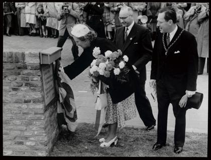 Koningin Juliana onthult in 1952 een gedenksteen in de walmuur bij het Victoriepark. Beeld: Regionaal Archief Alkmaar.