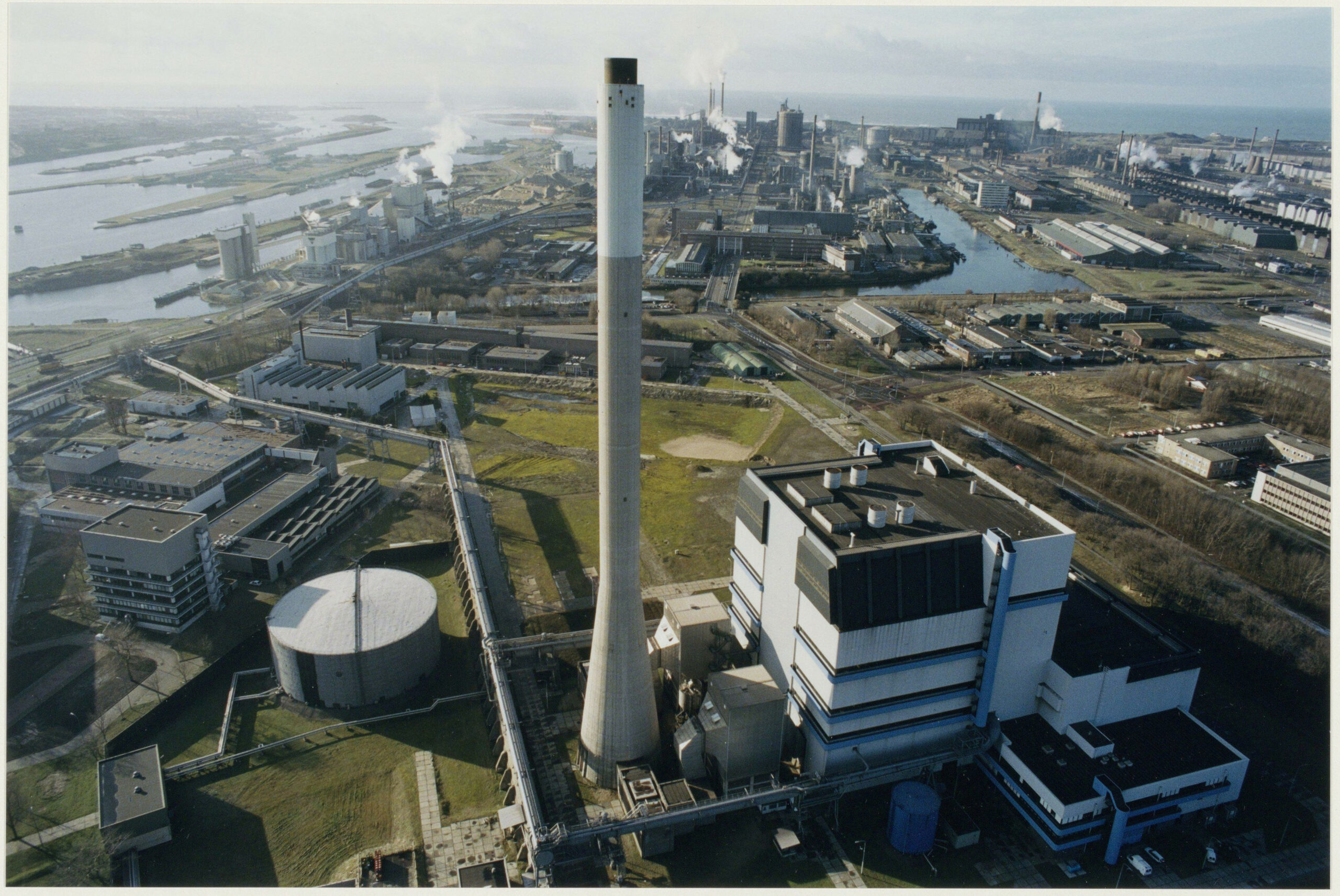 Luchtfoto met op de voorgrond de electriciteitscentrale UNA met aansluitend het bedrijfsterrein van Hoogovens Staal, 1998. Collectie Noord-Hollands Archief.