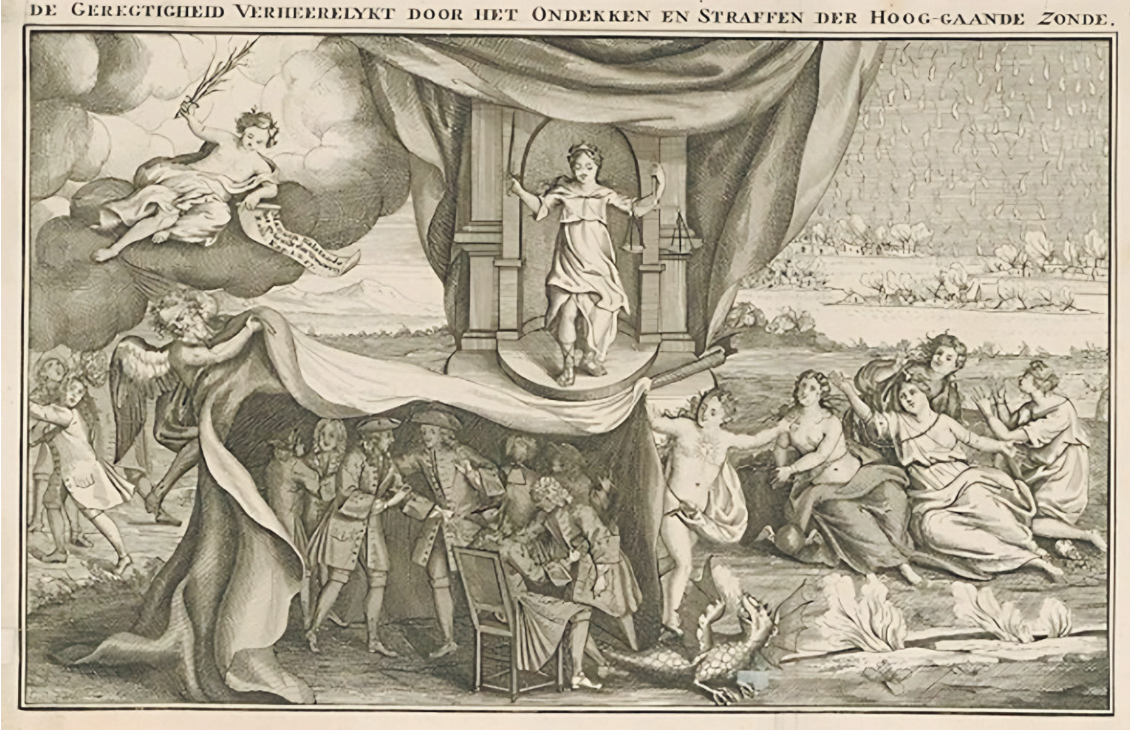 Illustratie uit het besproken boek. Allegorie op de ontdekking en bestraffing van sodomie. Justitia ‘onthult’ hier de sodomie (mannen onder het gordijn), met op de achtergrond de zwavelregen op Sodom en Gomorra. Op de banderol linksboven een Bijbeltekst uit Romeinen 1:26: ‘Mannen nalatende het gebruik der vrouwen.’ Deze anonieme prent heet ‘De Geregtigheid verheerlykt door het Ontdekken en Straffen der Hooggaande zonde’, 1730. Nr. 3716, Collectie Rijksmuseum, objectnummer RP-P-OB-77.723.