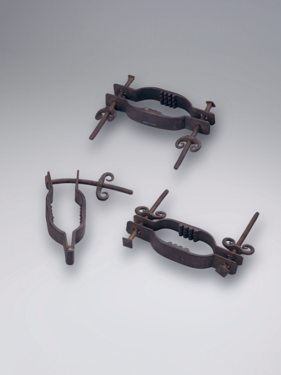 Illustratie uit het besproken boek. Scheenschroeven die tussen 1600 en 1800 werden gebruikt. Collectie Amsterdam Museum, inv.nrs KA 8425, KA 8426 en KA 8427.