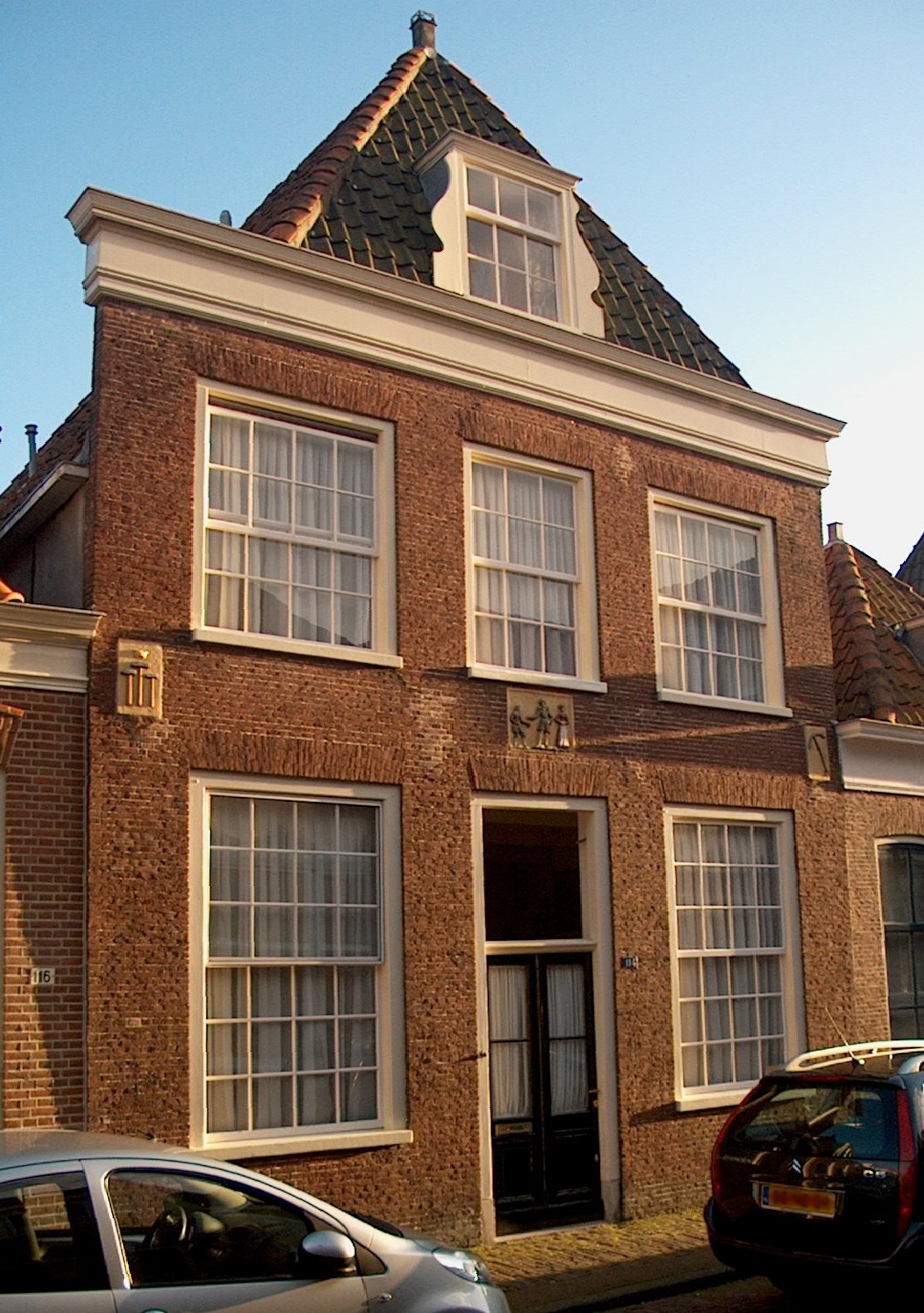 Het pand uit 1658 met de gevelsteen boven de voordeur. Foto: Erik Baas, CC BY-SA 3.0, via Wikimedia Commons.