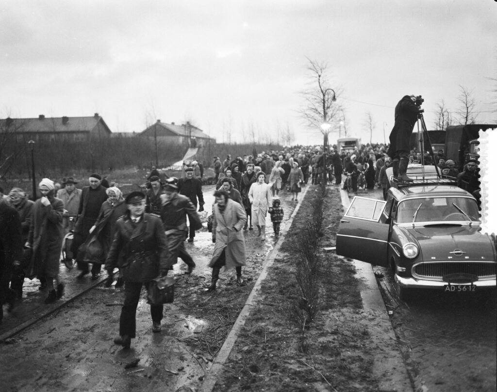 Ramp Tuindorp Oostzaan, de terugkeer. De bewoners trekken over de Kometensingel Tuindorp Oostzaan weer binnen, 29 januari 1960. Fotograaf: Joop van Bilsen / Anefo. Beeld Nationaal Archief / Bestanddeelnummer 910-9861, publiek domein.