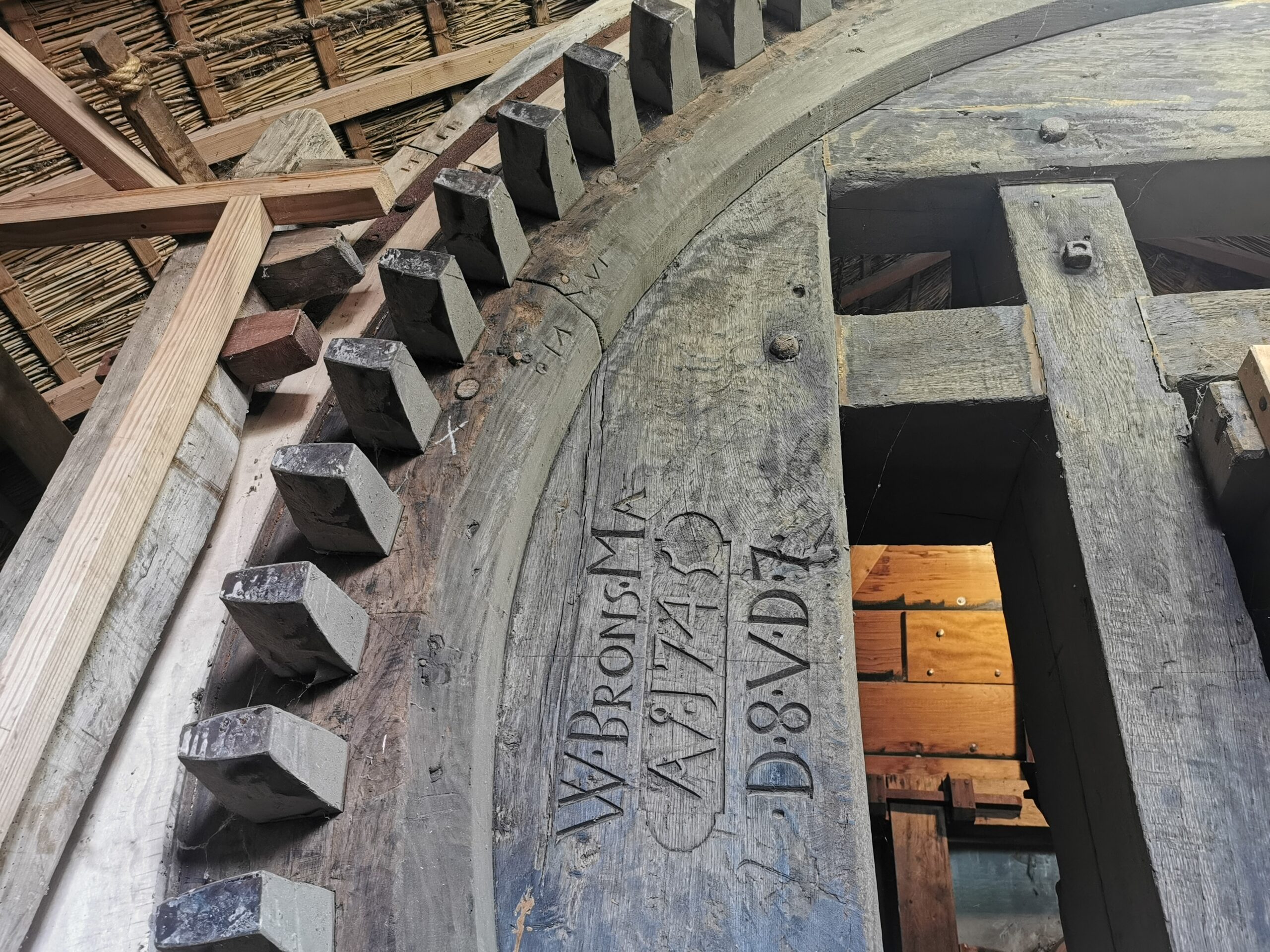 Het houten bovenwiel met opschrift ‘W. Brons’ en het jaartal 1745. Foto: Sarah Remmerts de Vries.