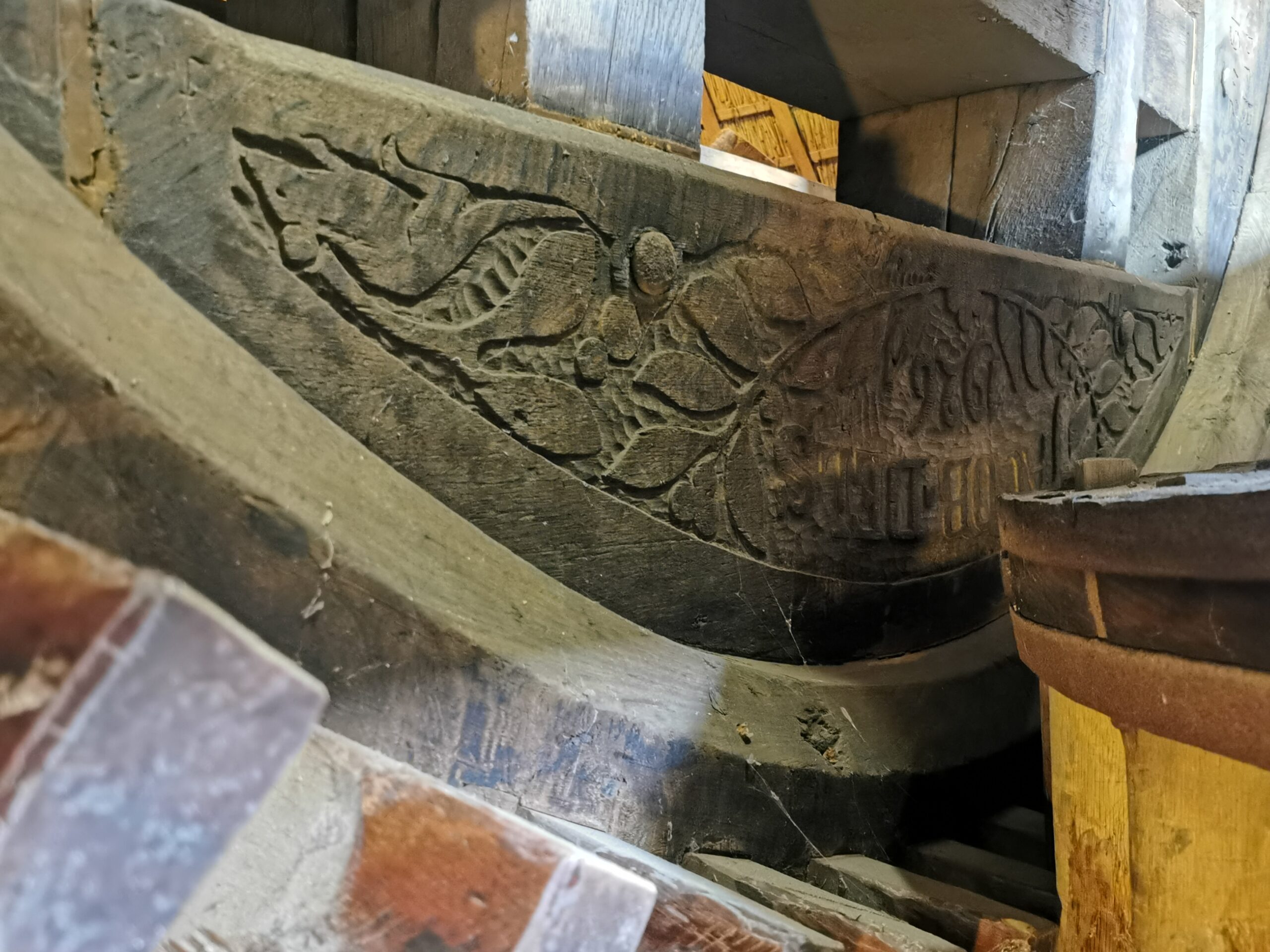Het bovenwiel met de naam ‘Jacob Dels’ en het jaartal 1926. Geheel links en rechts zijn muizen in het hout gesneden. Foto: Sarah Remmerts de Vries.
