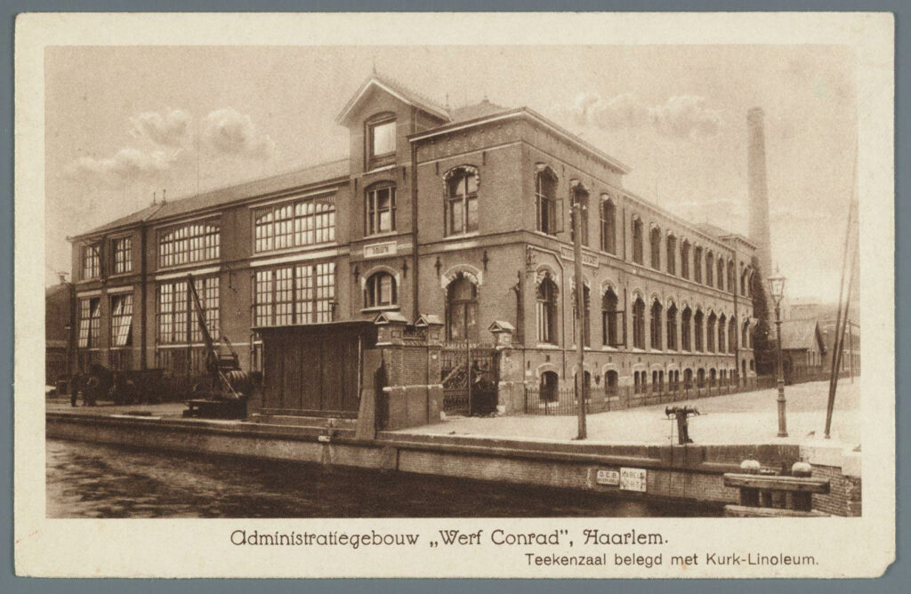Werf Conrad: Administratiegebouw Teekenzaal belegd met Kurk-Linoleum. Reclame van Jung & Co. Noord-Hollands Archief / Collectie van prentbriefkaarten van Lou Braakman te Haarlem, inventarisnummer 3149.