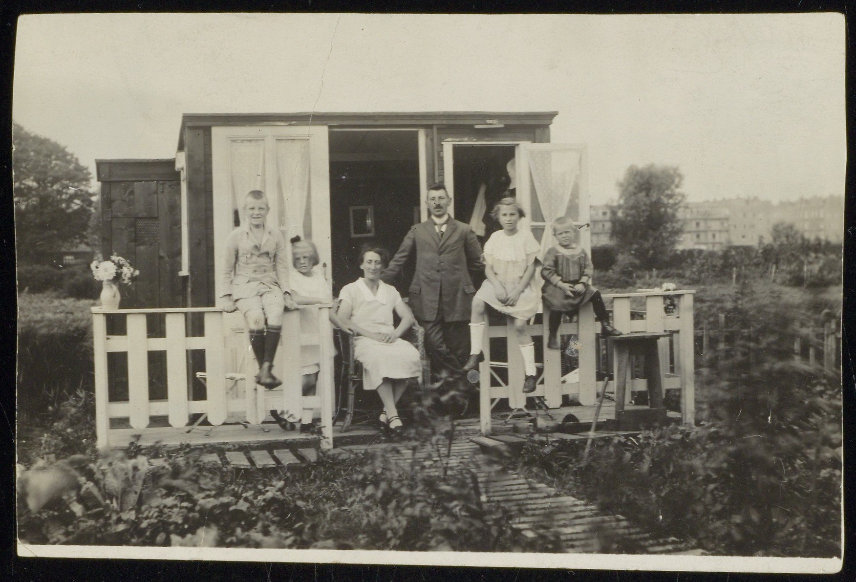 Het tuinhuisje van de familie Blijdemasschen op het volkstuinenpark Nut en Genoegen, ca. 1922. Stadsarchief Amsterdam, Afbeeldingsbestand ANWL00011000001