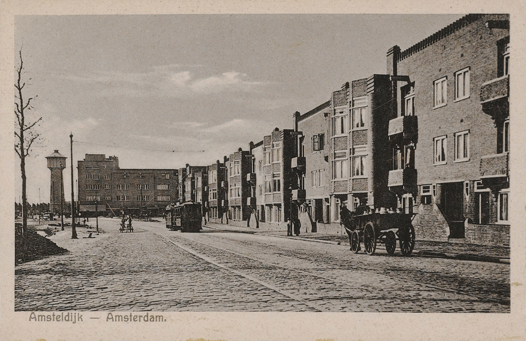 Prentbriefkaart van hoe de Amsteldijk er in 1922 uitzag. Vervaardiger: Kantoorboekhandel D.J. Draaijer. Stadsarchief Amsterdam, afbeeldingsbestand PRKBB00271000015.