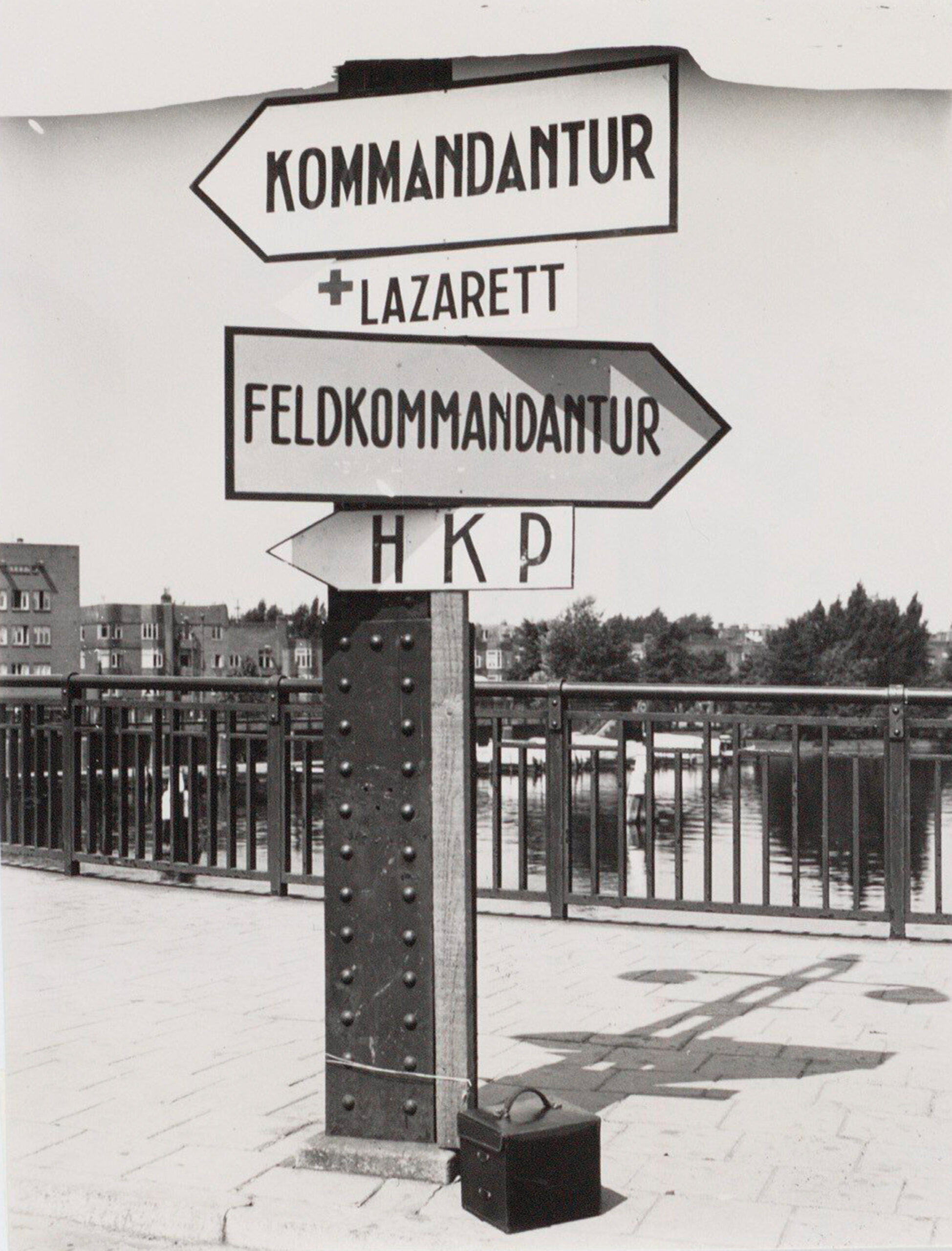 De Duitse soldaten zijn ons land binnengevallen. Op de Berlagebrug passen ze meteen de bordjes aan. Stadsarchief Amsterdam, afbeeldingsbestand OSIM00007003827.